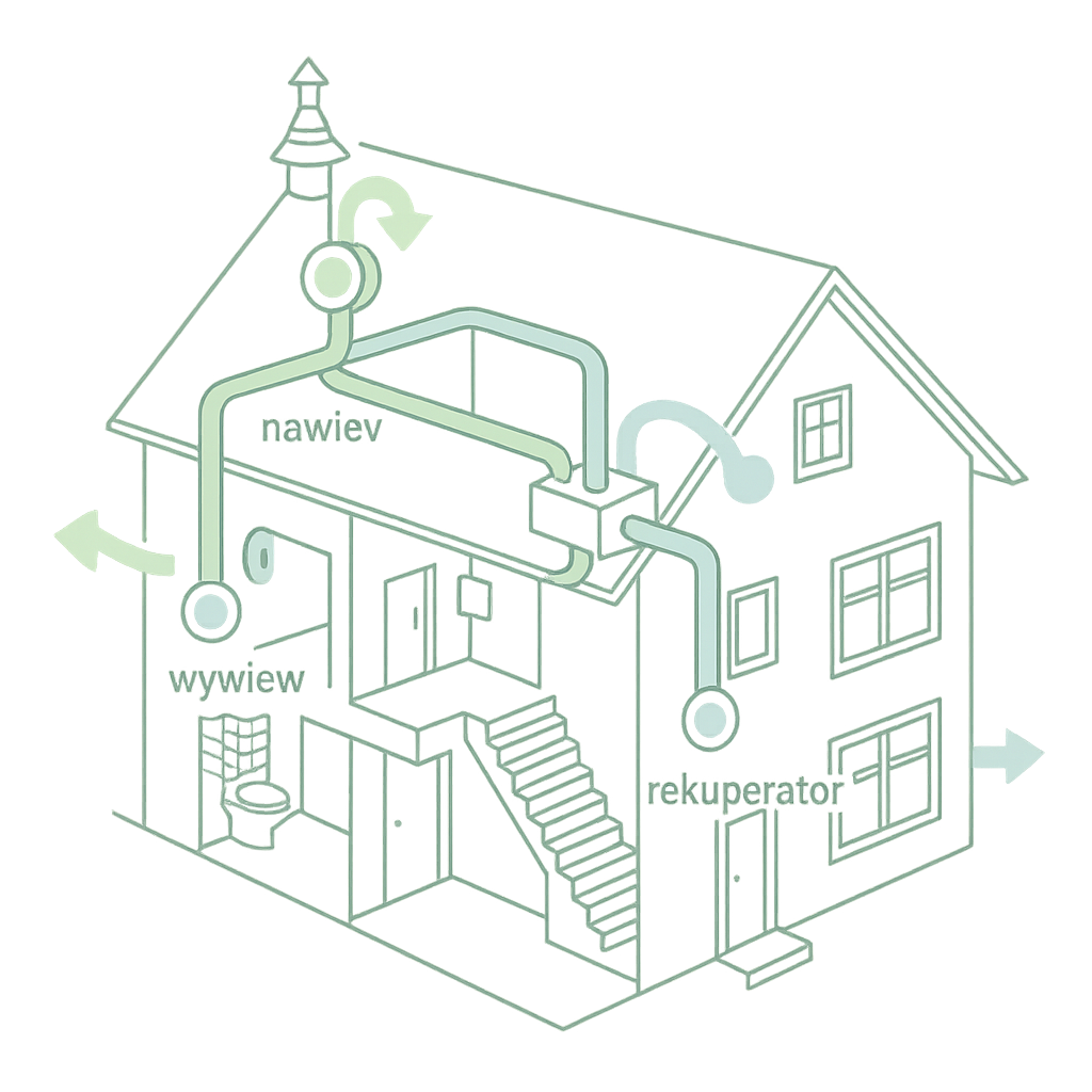 Rekuperacja to wentylacja mechaniczna z odzyskiem ciepła, która stale wymienia powietrze w budynku i odzyskuje energię z usuwanego wywiewu, aby wstępnie ogrzać (zimą) lub schłodzić (latem) nawiew. W rekuperatorze dwa oddzielne strumienie powietrza przepływają przez wymiennik, nie mieszając się, dzięki czemu minimalizujesz straty energii i rachunki. Filtry zatrzymują kurz, pyłki i część smogu, a automatyka (czujniki CO₂/wilgotności, by-pass letni, harmonogramy) dba o cichą i wydajną pracę. System może działać centralnie – obsługując cały dom siecią kanałów – lub punktowo, poprzez pojedyncze urządzenia ścienne idealne do modernizacji. Efekt: świeże, zdrowe powietrze i komfort o każdej porze roku.